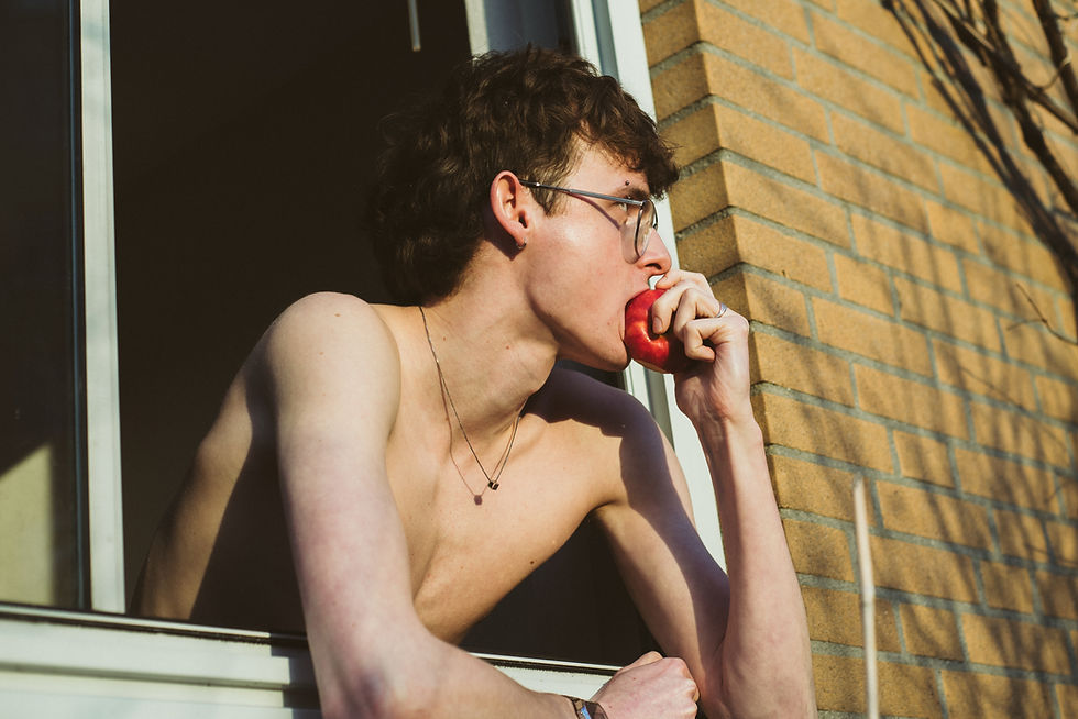 I found myself focusing on the details that the common eye often misses. The depth of his crystal-blue eyes, which seem to hold the coldness and calm of a Northern landscape. The texture of his hair, wild under the window light, and the honesty of his skin, which, through my camera, feels almost tactile, full of a grain that tells its own story. There is an organic sensuality in his way of being, a presence with the intensity and precision of an espresso master. Cas is a barista, and that discipline, the rigor of someone who understands the nuances of what is pure, filters into the nobility of his posture.